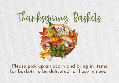 Please pick up an acorn and bring in items for baskets to be delivered to those in need. We are accepting donations of any unperishable items like: gravy, can milk, instant potatoes, dressing, cake mix & icing, etc.