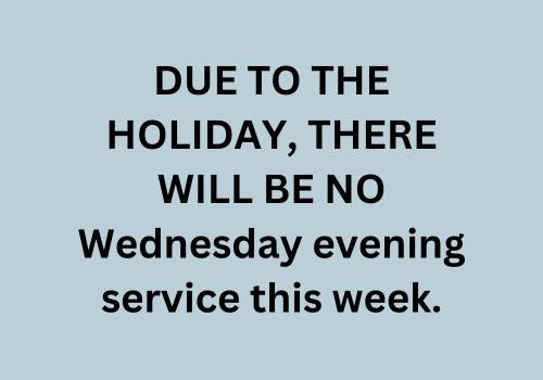 No Wednesday service this week Due to the holiday, there will be Wednesday evening service this week. Share this: Click to email a link to a friend (Opens in new window) Email Click to share on Facebook (Opens in new window) Facebook Click to share on X (Opens in new window) X Like Loading...