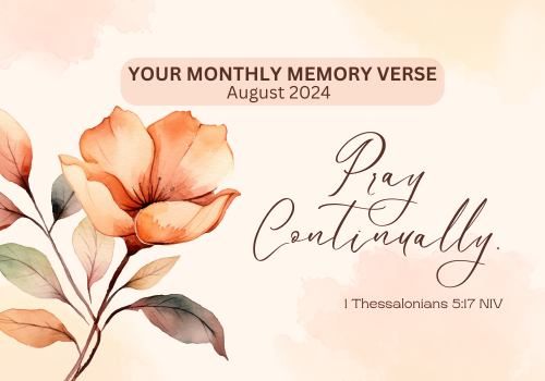 Here’s your memory verse for August 2024 Pray Continually. — 1 Thessalonians 5:17 NIV Share this: Click to email a link to a friend (Opens in new window) Email Click to share on Facebook (Opens in new window) Facebook Click to share on X (Opens in new window) X Like Loading...