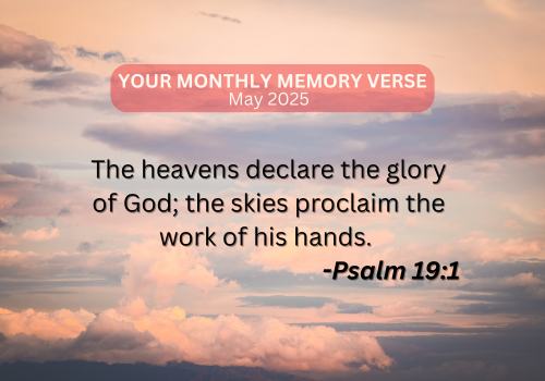 Here’s your monthly memory verse for May 2025 The heavens declare the glory of God; the skies proclaim the work of his hands. Psalm 19:1 Share this: Click to email a link to a friend (Opens in new window) Email Click to share on Facebook (Opens in new window) Facebook Click to share on X (Opens in new window) X Like Loading...